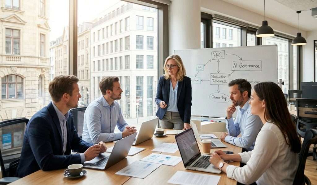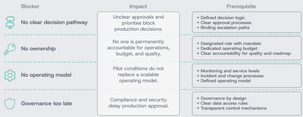 In practice, these problems can typically be traced back to four gaps that slow the transition into production. Each one is significant on its own; together, they cause decisions to stall, operations to remain unstructured, and the momentum built during the PoC to dissipate.