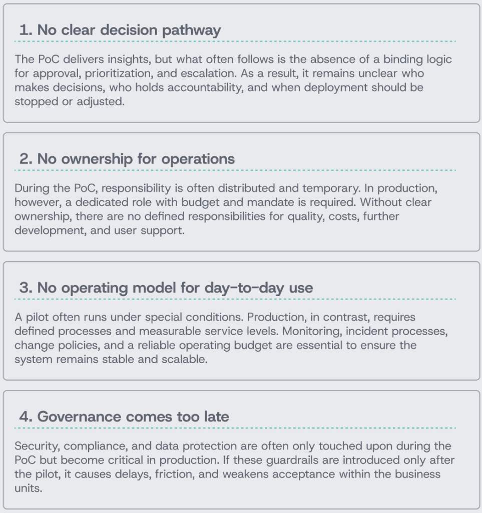 The willingness to invest and the technical feasibility are both present. What is missing is the transition from a working prototype to productive operations. A successful proof of concept (PoC) does not usually address what functioning AI actually looks like in day-to-day business, nor who takes lasting responsibility for quality, operations and further development.