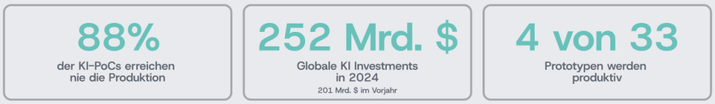 Eine Studie von IDC und Lenovo zeigt, dass nur 12 Prozent der KI-PoCs den Sprung in die Produktion schaffen. Im Durchschnitt werden also von 33 Prototypen gerade einmal vier produktiv. Gleichzeitig stiegen die globalen Investitionen in Unternehmens-KI laut dem Stanford AI Index 2024 auf 252 Milliarden Dollar. Im Vorjahr lagen sie noch bei 201 Milliarden Dollar.