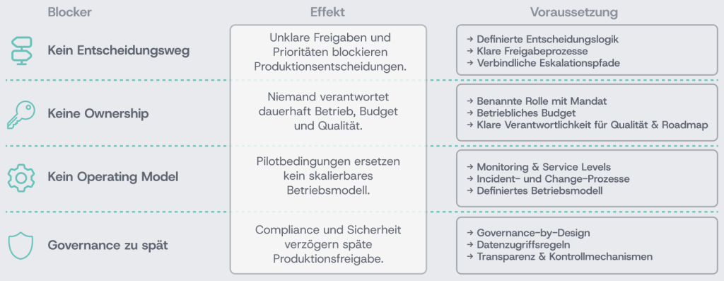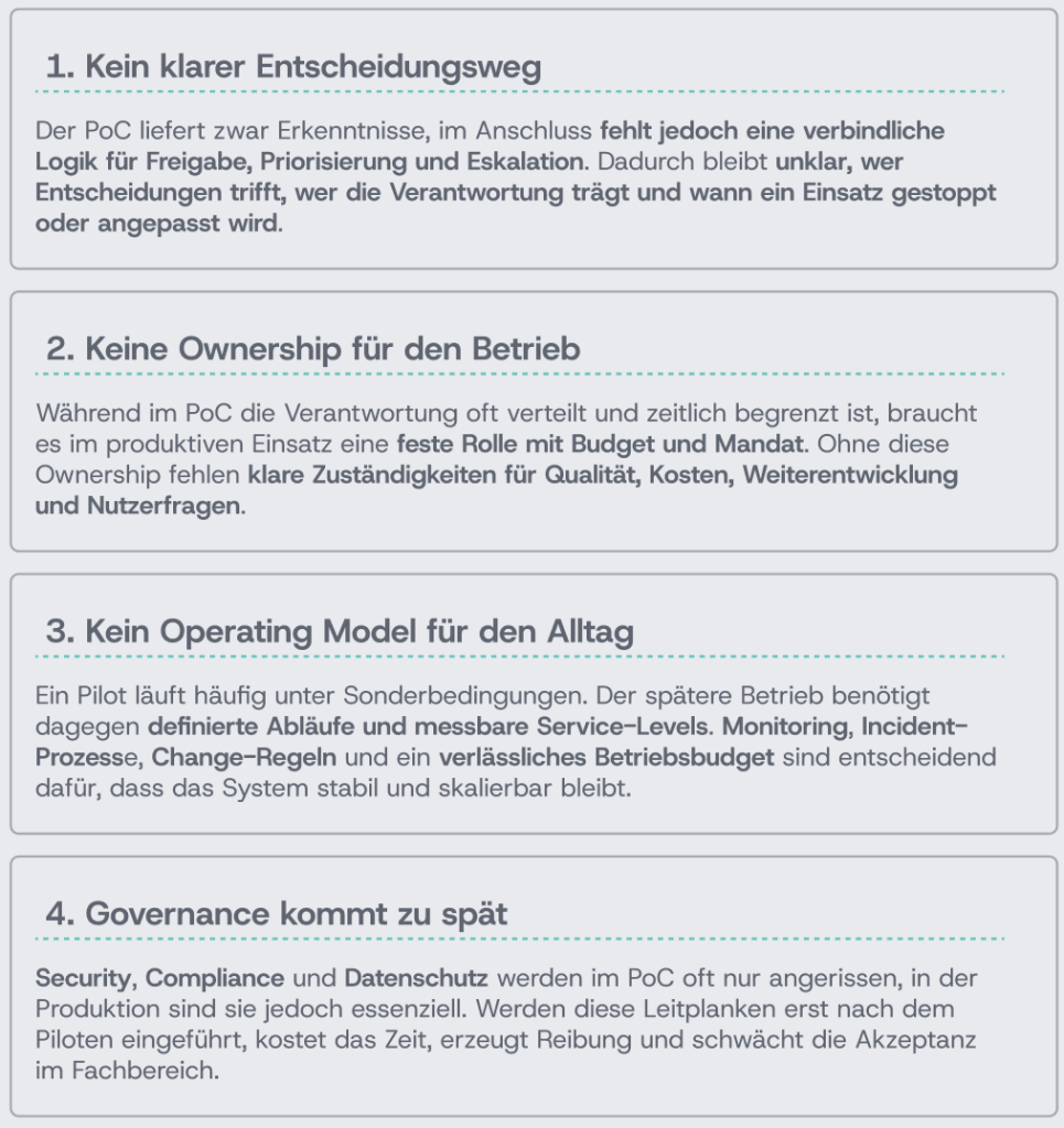 In der Praxis lassen sich diese Probleme häufig auf vier Lücken zurückführen, die den Übergang in die Produktion ausbremsen. Einzeln wirken sie schon stark, gemeinsam sorgen sie dafür, dass Entscheidungen hängen bleiben, der Betrieb ungeordnet bleibt und das Momentum aus dem PoC verloren geht.