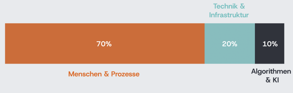 Über Branchen hinweg zeigt sich ein stabiles Muster. Rund 70 Prozent der Reibungsverluste entstehen durch Menschen und Prozesse, etwa 20 Prozent durch Technik und Infrastruktur, und rund 10 Prozent durch Algorithmen oder Modelle. Der größte Hebel liegt also nicht in der Technologie, sondern in der Organisation des Einsatzes. Erst wenn KI im Alltag verlässlich funktioniert, akzeptiert wird und dauerhaft Wertbeiträge liefert, ist der Weg vom Prototyp in die Produktion tatsächlich geschafft.